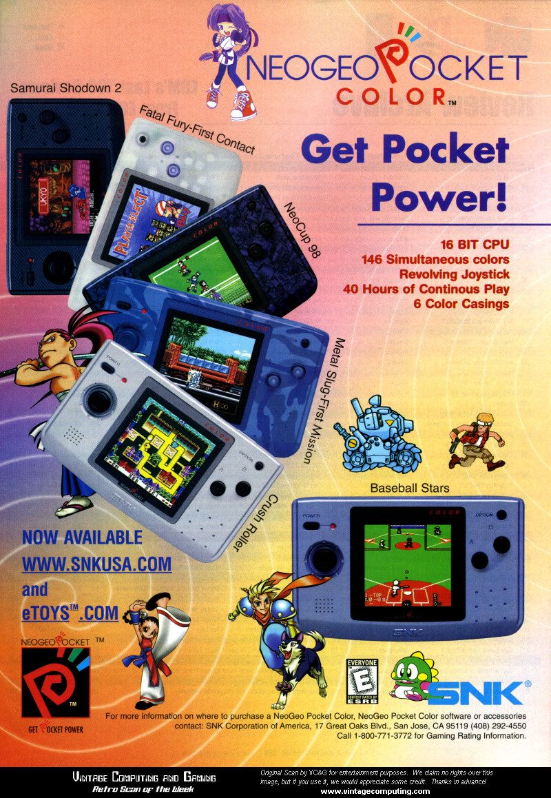 The neo geo pocket color is a 16 bit color handheld video game console manufactured by snk it is a successor to snk s monochrome neo geo pocket handheld which debuted in 1998 in japan with the color being fully backward compatible the neo geo pocket color was released on march 16 1999 in japan august 6 1999 in north america and on october 1 1999 in europe entering markets all dominated. 1999 04 30 neo geo pocket color. Neo geo pocket color.